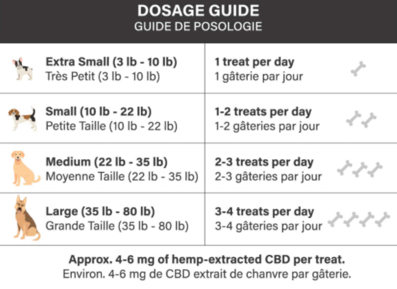 You can use our CBD treats for pets the same way as your non-CBD treats. For dosage guidance, refer to the dosage table above or the back of the package. Dosage can vary based on animal weight and severity of any condition.