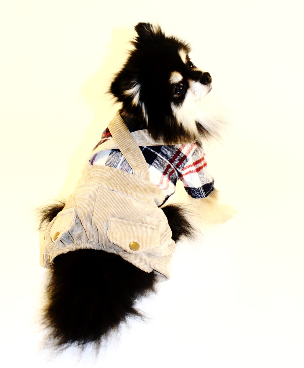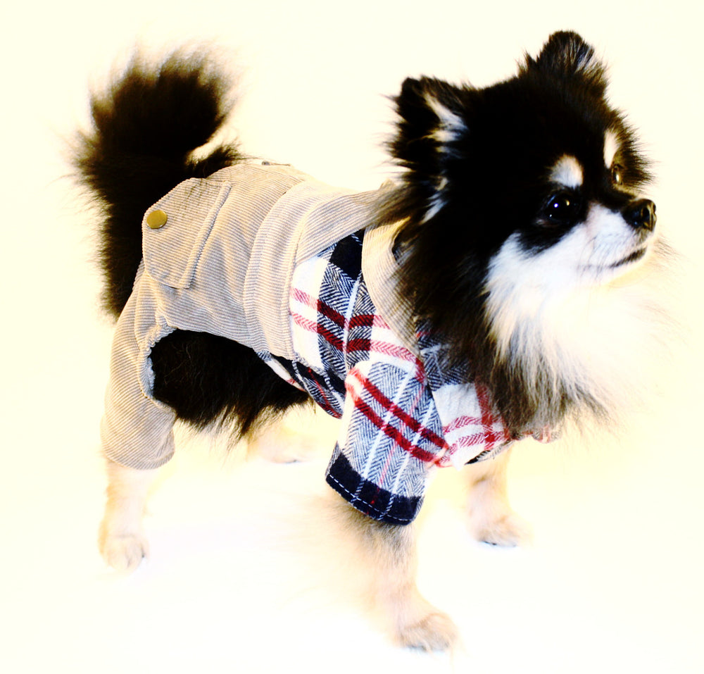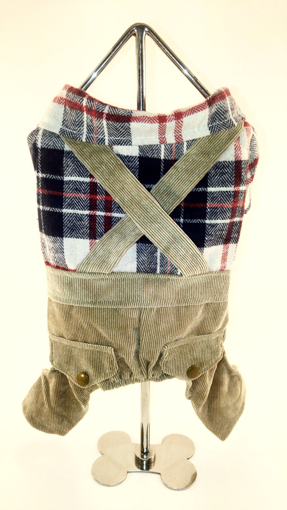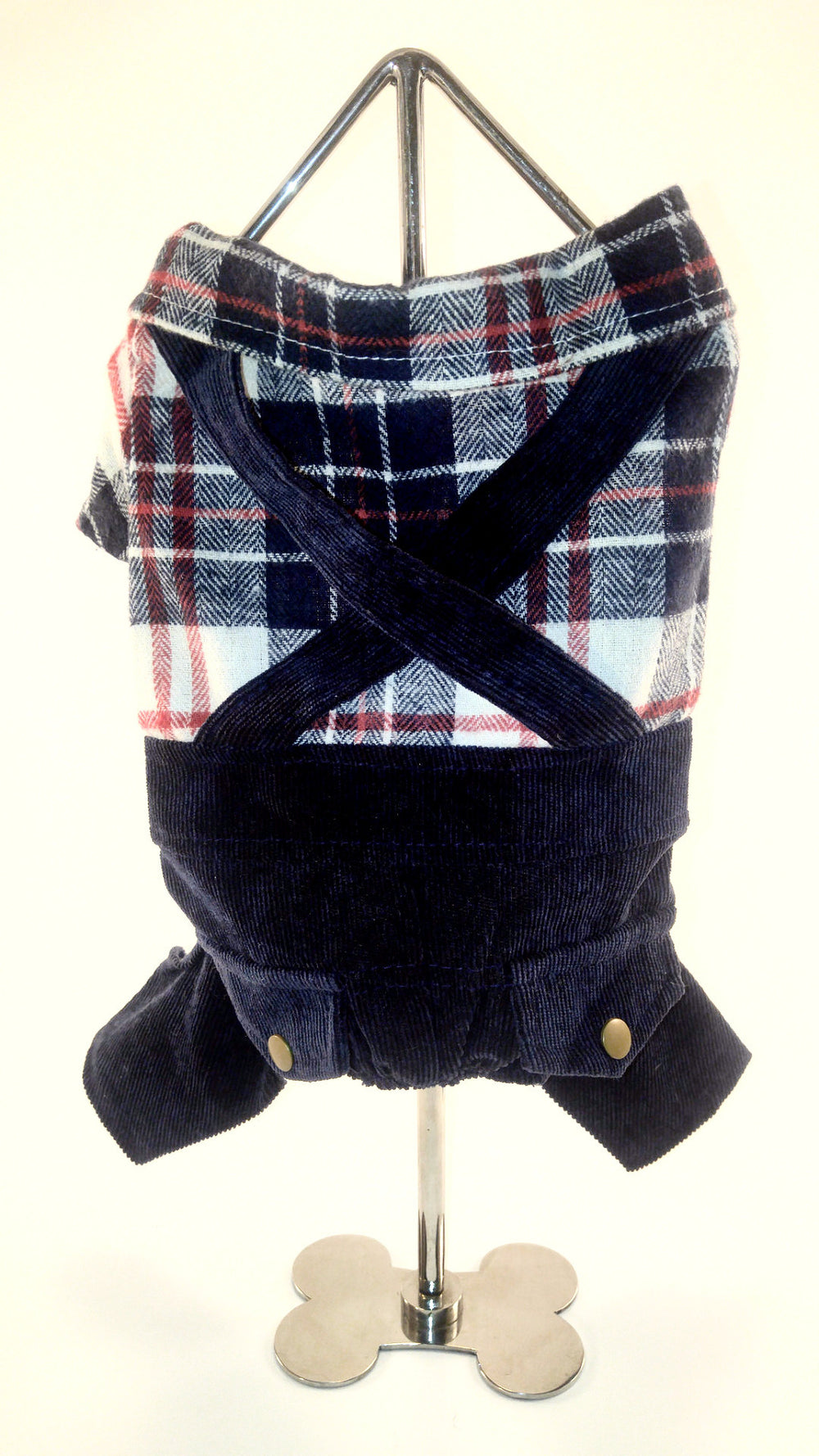 This plaid and corduroy suspender onesie is the cutest casual yet dapper set of the season. This outfit is super soft and comfortable for a relaxing evening by the fireplace at the cottage and at the same time ready for a night out playing with friends in town. Your pup is ready for whatever activity comes along in this winter version of our Dapper Dog collection. Front is detailed with durable metal snap buttons for easy on and off.